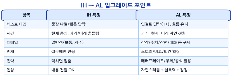 IH와 AL의 핵심 차이는 ‘말할 수 있느냐’가 아니라, ‘연결된 단락을 지속할 수 있느냐’입니다. IH는 Advanced 기능을 일부 수행하지만, 다양한 주제에서 안정적으로 유지하기 어렵고(시간/연결어/디테일에서 흔들림), AL은 단락 단위로 이야기를 유지하면서 예기치 않은 상황에도 해결/우회 전략을 보여줍니다.
