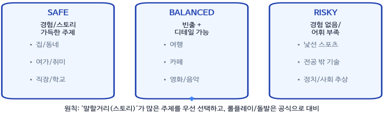 말할 경험과 스토리가 많은 주제를 선택하세요. 말할 거리가 없으면 아무리 문장이 좋아도 길게, 자연스럽게 이어가기 어렵습니다.